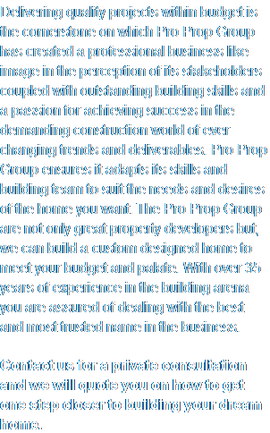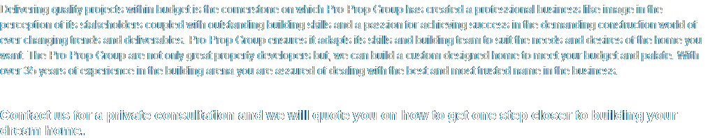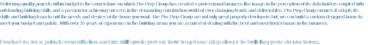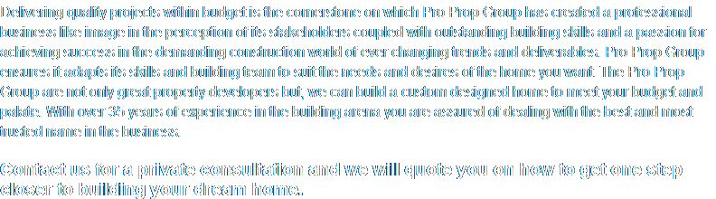 Your dream home can become a reality by making use of our special building package promotion starting from R7995/M2.  Delivering quality projects within budget is the cornerstone on which Pro Prop Group has created a professional business like image in the perception of its stakeholders coupled with outstanding building skills and a passion for achieving success in the demanding construction world of ever changing trends and deliverables. Pro Prop Group ensures it adapts its skills and building team to suit the needs and desires of the home you want. The Pro Prop Group are not only great property developers but, we can build a custom designed home to meet your budget and palate. With over 35 years of experience in the building arena you are assured of dealing with the best and most trusted name in the business.    Contact us for a private consultation and we will quote you on how to get one step closer to building your dream home.
